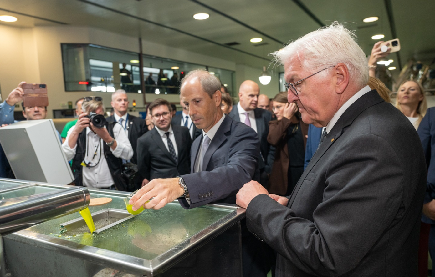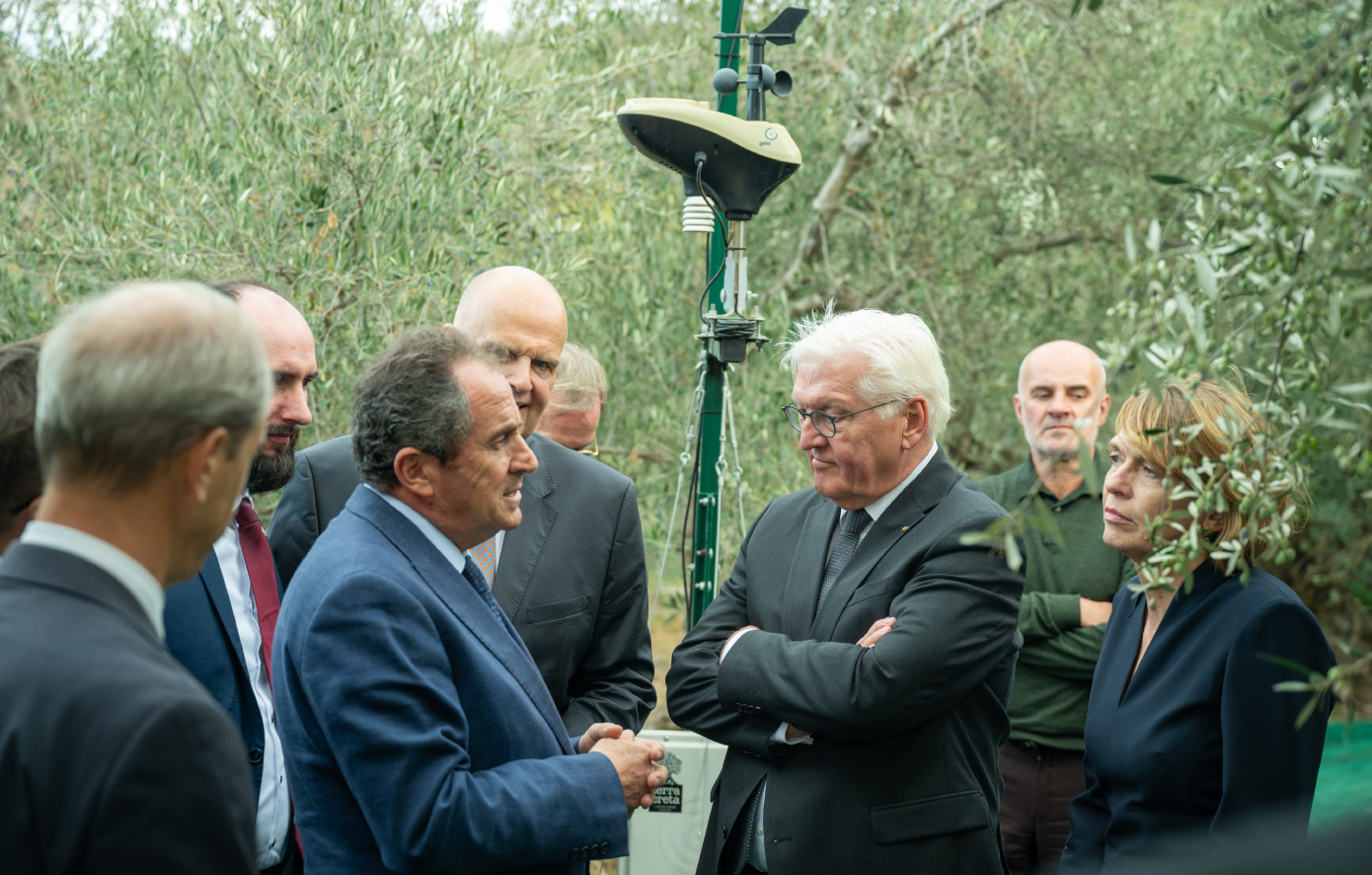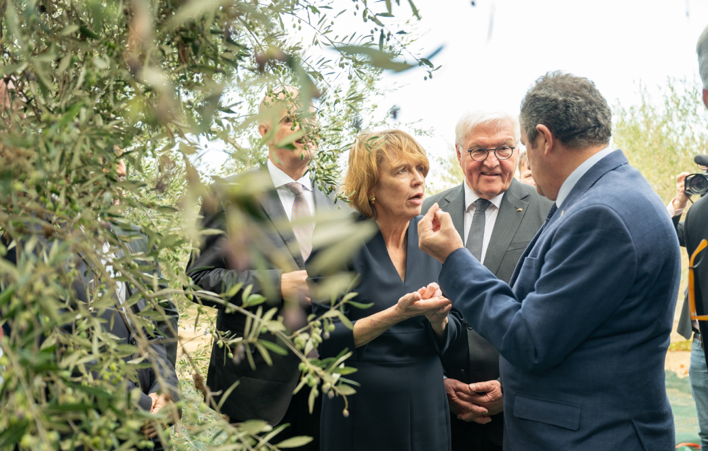 Ο Φώτης Σουσαλής, Olive Oil Plant & Sourcing Director της Melissa-Kikizas, υποδέχθηκε τον Γερμανό Πρόεδρο και τον ξενάγησε στις εγκαταστάσεις του υπερσύγχρονου ελαιοποιείου της Terra Creta, όπου περιηγήθηκαν στη γραμμή παραγωγής ελαιολάδου. Στη συνέχεια, είχαν την ευκαιρία να συνομιλήσουν με τους παραγωγούς της Ακαδημίας Ελιάς Terra Creta, μια πρωτοβουλία της εταιρείας που δημιουργήθηκε με σκοπό την αναβάθμιση της παραγωγής ελιάς και ελαιόλαδου, εκπαιδεύοντας τους ελαιοπαραγωγούς του τόπου στις πιο σύγχρονες πρακτικές με τη χρήση εργαλείων Ευφυούς Γεωργίας. Συνάμα, συζήτησαν σχετικά με την εφαρμογή των αρχών της αναγεννητικής γεωργίας στην παραγωγή ελαιολάδου, και μυήθηκαν στην ελαιογευσία του πολυβραβευμένου εξαιρετικού παρθένου ελαιολάδου Terra Creta.