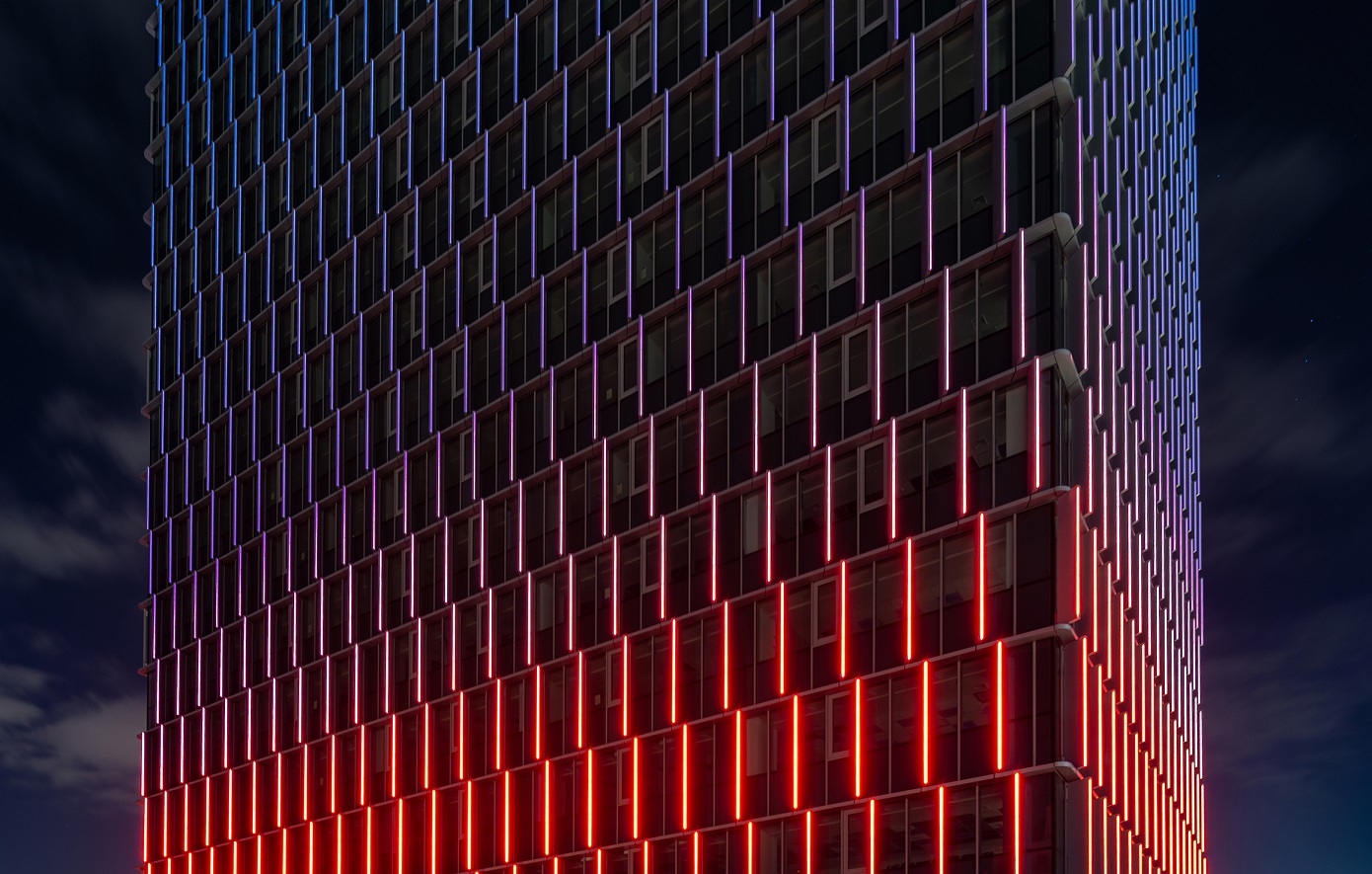 Η νέα πρόσοψη του Πύργου Πειραιά, με τον δυναμικό σχεδιασμό των οριζόντιων και κατακόρυφων περσίδων, συνδυάζει αισθητική και λειτουργικότητα. Εξασφαλίζει ιδανική σκίαση, μειώνει τις ενεργειακές απαιτήσεις του κτηρίου και προσφέρει μια μοναδική οπτική εμπειρία, αναβαθμίζοντας το αστικό τοπίο.