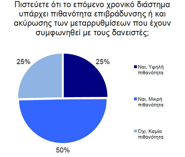Παράλληλα, στους CEOs, ζητήθηκε να εκφράσουν τη γνώμη τους για την πιθανότητα επιβράδυνσης ή και ακύρωσης των μεταρρυθμίσεων που έχουν συμφωνηθεί με τους δανειστές κατά το επόμενο χρονικό διάστημα. Το 25% των CEOs υποστηρίζει ότι υπάρχει υψηλή πιθανότητα οπισθοδρόμησης στην εφαρμογή των μεταρρυθμίσεων, ενώ ένας στους δύο CEOs πιστεύει ότι η πιθανότητα αυτή είναι μικρή. Παράλληλα το υπόλοιπο 25% των CEOs θεωρεί ότι δεν υπάρχει καμία πιθανότητα επιβράδυνσης ή και ακύρωσης των μεταρρυθμίσεων.