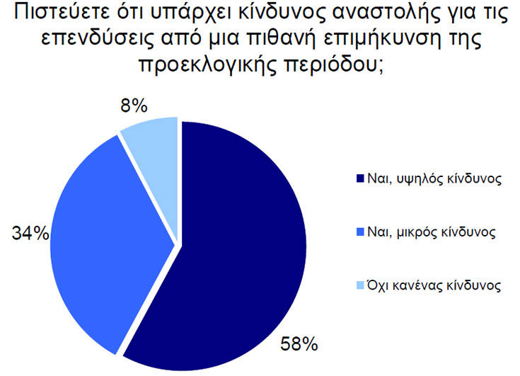 Ειδικότερα, οι CEOs ρωτήθηκαν για τον κίνδυνο αναστολής των επενδύσεων λόγω πιθανής επιμήκυνσης της προεκλογικής περιόδου. Σχεδόν έξι στους δέκα CEOs θεωρούν ότι ο κίνδυνος είναι υψηλός, ενώ το 34% πιστεύει ότι ο κίνδυνος είναι μικρός. Από το σύνολο των CEOs μόνο το 8% υποστηρίζει ότι από μια πιθανή επιμήκυνση της προεκλογικής περιόδου δεν υπάρχει κανένας κίνδυνος αναστολής των επενδύσεων.