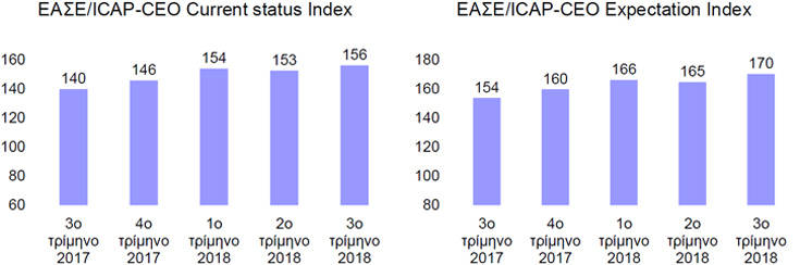 Σε ανοδική τάση επανήλθε ο γενικός δείκτης οικονομικού κλίματος (ΕΑΣΕ/ICAP-CEO General Index) το 3ο τρίμηνο του 2018 και διαμορφώθηκε στις 163 μονάδες (έναντι 159 το προηγούμενο τρίμηνο). Η άνοδος του δείκτη αποτυπώνει την επαναφορά της αισιοδοξίας μεταξύ των CEOs σχετικά με την πορεία της ελληνικής οικονομίας, που έχει ήδη εκφραστεί τα προηγούμενα τρίμηνα. Παράλληλα οι CEOs εκφράζουν τους σταθερή προσήλωση τους στην αναγκαιότητα των μεταρρυθμίσεων.