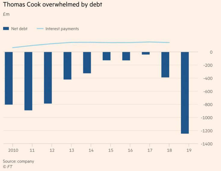 Η κατάρρευση της Thomas Cook έρχεται οκτώ μήνες αφότου ανακοίνωσε την πρόθεσή της να πουλήσει την κερδοφόρα αεροπορική της εταιρεία ως μέσο για την υποστήριξη της επιχείρησης τουριστικών πρακτόρων. Ωστόσο, τον Μάιο αποκάλυψε καθαρό χρέος ύψους 1,2 δισ. λίρες. Καταγράφηκε επίσης 1.1 δισ. λίρες απομείωση ενεργητικού από τη συγχώνευση το 2007 με την MyTravel, τη βρετανική εταιρεία διακοπών.