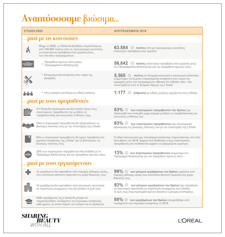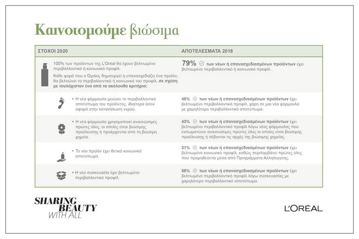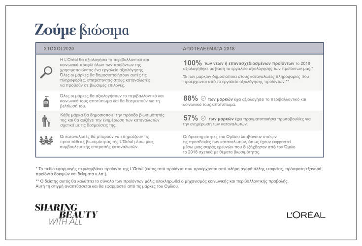 Σχετικά με το Sharing Beauty with All: Το πρόγραμμα Sharing Beauty with All ξεκίνησε το 2013. Πλήρως ενσωματωμένο σε ολόκληρη την αλυσίδα αξίας του Ομίλου, συνοψίζει τις δεσμεύσεις της L’Oréal σχετικά με τη βιώσιμη ανάπτυξη έως το 2020 και αντιμετωπίζει όλες τις επιπτώσεις της: από τον σχεδιασμό των προϊόντων μέχρι και τη διανομή τους, συμπεριλαμβανομένης της διαδικασίας παραγωγής ή την προέλευση των συστατικών. Κάθε χρόνο, η L’Oréal επικοινωνεί με διαφάνεια, παρέχοντας στοιχεία, σχετικά με την πρόοδό της. Σήμερα, ο Όμιλος είναι μια από τις εταιρείες των οποίων η φιλοδοξία και η σοβαρότητα σχετικά με την βιώσιμη ανάπτυξη είναι από τις πλέον αναγνωρισμένες σε διεθνές επίπεδο. Για περισσότερες πληροφορίες: www.loreal.com/loreal-sharing-beauty-with-all