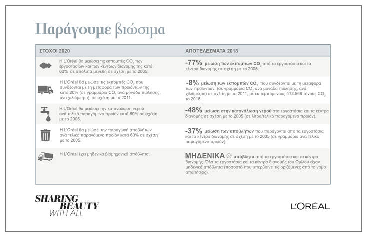 Η L’Oréal Hellas παρουσίασε, για πρώτη φορά στην Ελλάδα, τη συναρπαστική πορεία του παγκόσμιου προγράμματος βιώσιμης ανάπτυξης Sharing Beauty With All και του αποτυπώματός του σε παγκόσμιο και τοπικό επίπεδο. Το πρόγραμμα βιωσιμότητας Sharing Beauty With All, ξεκίνησε το 2013 και έχει ενσωματωθεί πλήρως σε όλη την αλυσίδα αξίας του Ομίλου, θέτοντας φιλόδοξους, απτούς και μετρήσιμους στόχους βιώσιμης ανάπτυξης προς υλοποίηση, με πρώτο σημαντικό ορόσημο το 2020. Μέσω του προγράμματος, όλες οι διαδικασίες του Ομίλου, από το σχεδιασμό των προϊόντων μέχρι και τη διανομή τους, συμπεριλαμβανομένης της διαδικασίας παραγωγής ή της προέλευσης συστατικών, αξιολογούνται με στόχο τη μείωση του περιβαλλοντικού τους αποτυπώματος.