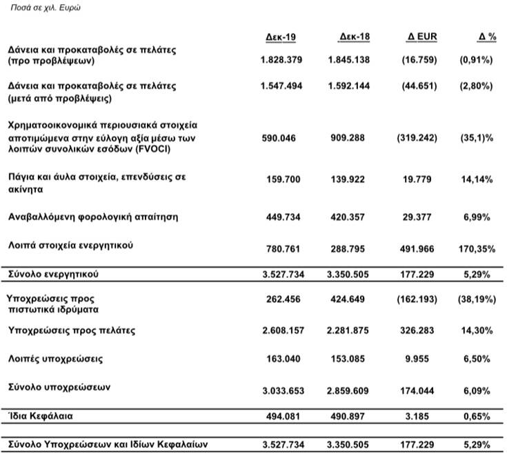 - Οι καταθέσεις διαμορφώθηκαν σε 2,6 δισ. ευρώ αυξημένες κατά 14,3% σε σχέση με την 12.2018.