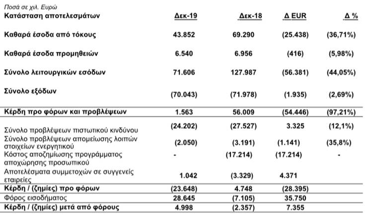 - Οι ζημιές προ φόρων και προβλέψεων διαμορφώθηκαν σε €23,7 εκατ. ευρώ, έναντι κερδών ύψους €4,7 εκατ. ευρώ σε σχέση με την αντίστοιχη περσινή χρήση (31.12.2018), λόγω της μείωσης των λειτουργικών εσόδων κατά 44,1% σε σχέση με την αντίστοιχη χρήση του 2018. Σημειώνεται ότι στα λειτουργικά αποτελέσματα της χρήσης 2018 συμπεριλαμβάνονται και μη επαναλαμβανόμενα κέρδη 47 εκατ. ευρώ από τη μεταβίβαση χαρτοφυλακίου μέσω τιτλοποίησης (Metexelixis).