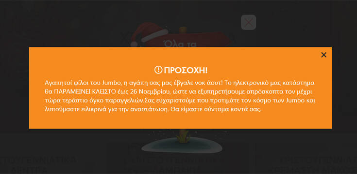 Συγκεκριμένα το μήνυμα στο site της εταιρείας αναφέρει: «Αγαπητοί φίλοι του Jumbo, η αγάπη σας μας έβγαλε νοκ άουτ! Το ηλεκτρονικό μας κατάστημα θα ΠΑΡΑΜΕΙΝΕΙ ΚΛΕΙΣΤΟ έως 26 Νοεμβρίου, ώστε να εξυπηρετήσουμε απρόσκοπτα τον μέχρι τώρα τεράστιο όγκο παραγγελιών. Σας ευχαριστούμε που προτιμάτε τον κόσμο των Jumbo και λυπούμαστε ειλικρινά για την αναστάτωση. Θα είμαστε σύντομα κοντά σας».