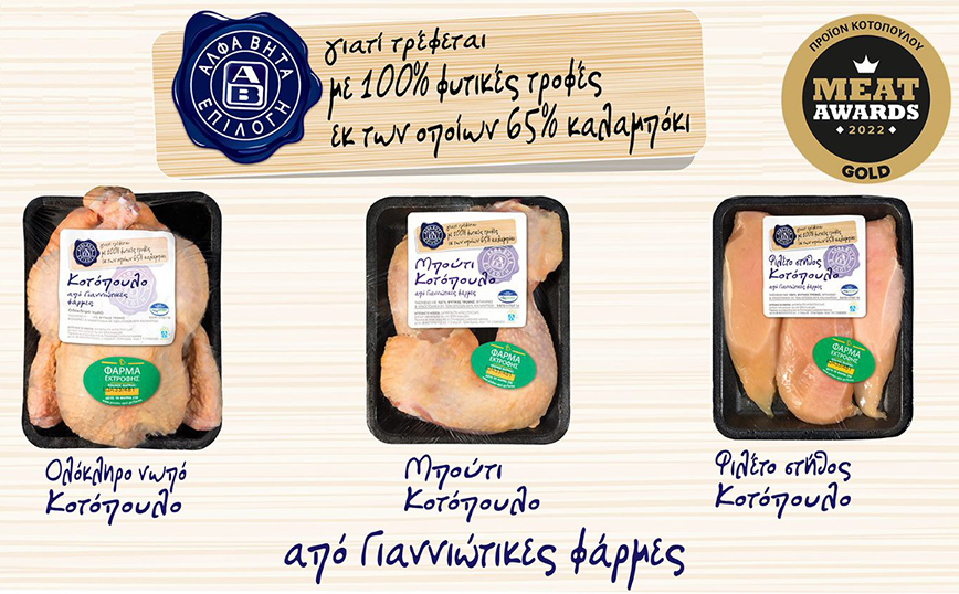 Πιο συγκεκριμένα, έλαβε Χρυσό βραβείο στην κατηγορία «Προϊόν Κοτόπουλου» για το Κοτόπουλο ΑΒ Επιλογή από Γιαννιώτικες φάρμες. Το κοτόπουλο που μπορεί κανείς να βρει αποκλειστικά στα ΑΒ Βασιλόπουλος γεννιέται και μεγαλώνει σε φάρμες στην ορεινή Γιαννιώτικη ύπαιθρο, τρέφεται με 100% φυτικές τροφές, πλούσιες σε καλαμπόκι που του προσδίδουν το χαρακτηριστικό κιτρινωπό χρώμα. Ο τρόπος εκτροφής, για πάνω από 50 ημέρες, και η συγκεκριμένη φυλή κοτόπουλων το διαφοροποιούν γευστικά και θρεπτικά. Σημειώνεται ότι η εκτροφή του γίνεται και σύμφωνα με τις προδιαγραφές και αρχές που διέπουν την εταιρεία σε ό,τι αφορά την ευζωία των ζώων.