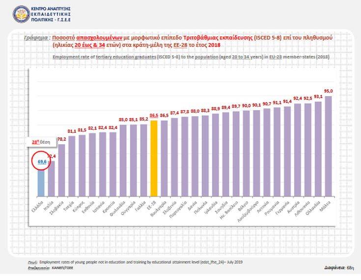 Αρνητική πρωτιά ως προς την ανεργία των νέων αποφοίτων τριτοβάθμιας εκπαίδευσης, με ποσοστό 20%, κατέχει η Ελλάδα στην Ευρωπαϊκή Ένωση των «28». Ταυτόχρονα βρίσκεται στην 25η θέση ως προς το ετήσιο ισοδύναμο καθαρό εισόδημα των αποφοίτων τριτοβάθμιας εκπαίδευσης, ενώ παρατηρείται και το φαινόμενο της κάθετης αναντιστοιχίας δυνατοτήτων, δηλαδή πτυχιούχοι και κάτοχοι μεταπτυχιακών απασχολούνται σε θέσεις εργασίας πολύ κατώτερες από το εκπαιδευτικό επίπεδο και τα προσόντα που διαθέτουν, όπως προκύπτει από έρευνα του Κέντρου Ανάπτυξης Εκπαιδευτικής Πολιτικής (ΚΑΝΕΠ) της ΓΣΕΕ σχετικά με την εκπαίδευση και την απασχόληση στη χώρα μας.