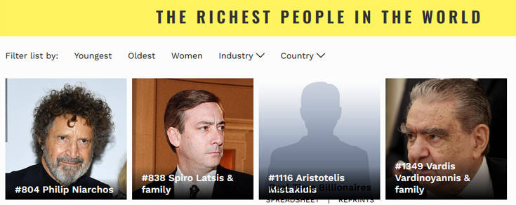 Ο Αριστοτέλης Μυστακίδης καταλαμβάνει την 1.116η θέση και 2,1 δισ. δολάρια και ο Βαρδής Βαρδινογιάννης την 1.349η θέση.