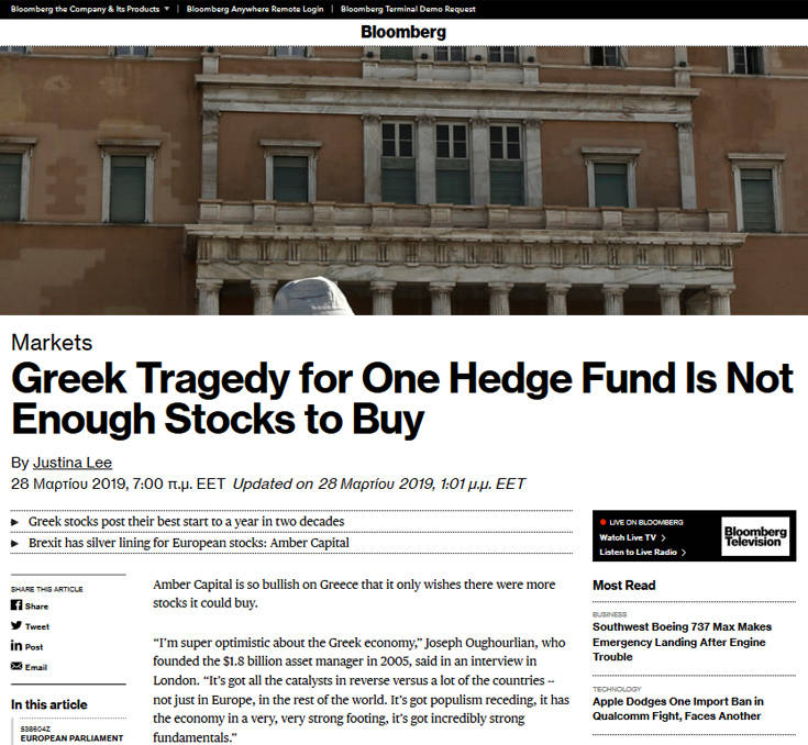 Τη μεγάλη αισιοδοξία του για την ελληνική οικονομία εκφράζει ο Joseph Oughourlian, ιδρυτής του fund ύψους 1,8 δισεκατομμυρίων δολαρίων Amber Capital. Όπως τιτλοφορεί το δημοσίευμά του το Bloomberg, η «ελληνική τραγωδία» του είναι πως δεν υπάρχουν αρκετές μετοχές να αγοράσει.
