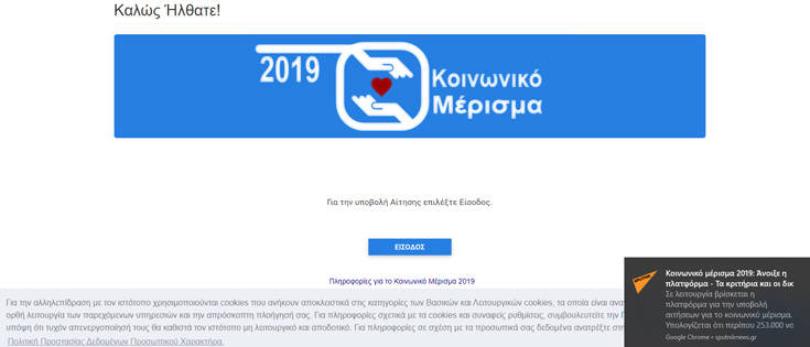 Σε λειτουργία βρίσκεται η ηλεκτρονική πλατφόρμα www.koinonikomerisma.gr για την υποβολή αιτήσεων για το κοινωνικό μέρισμα του 2019, η οποία άνοιξε σήμερα Τρίτη.