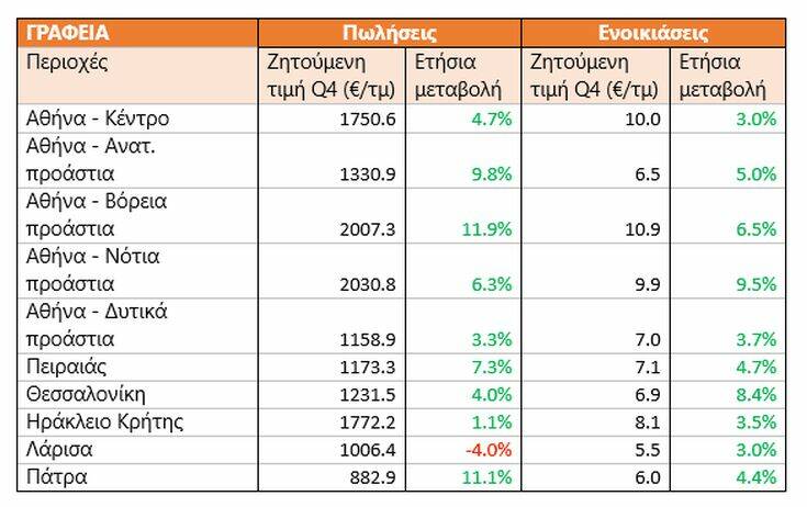 Σε βασικές περιοχές της χώρας (Αθήνα, Πειραιά, Θεσσαλονίκη, Ηράκλειο, Λάρισα και Πάτρα) οι ζητούμενες τιμές ενοικίασης γραφείων παρουσιάζουν αύξηση το τελευταίο τρίμηνο του 2020, σε σχέση με την αντίστοιχη περίοδο του 2019, με τη σημαντικότερη μεταβολή να παρατηρείται στα νότια προάστια της Αθήνας (+9,5%) και στη Θεσσαλονίκη (+8,4%).