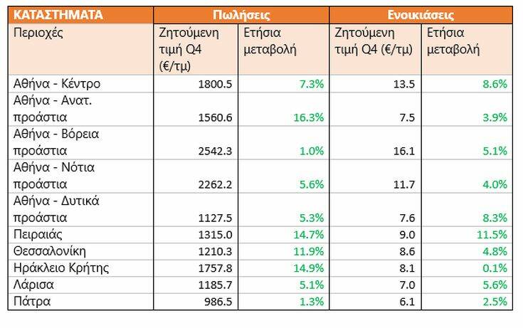 Όσον αφορά τα καταστήματα, σημαντικές αυξήσεις παρατηρούνται τόσο στις ζητούμενες τιμές ενοικίασης όσο και στις τιμές πώλησης σε όλες τις περιοχές της έρευνας, με τις μεγαλύτερες μεταβολές να παρατηρούνται στις τιμές πώλησης καταστημάτων στα ανατολικά προάστια της Αθήνας (+16,3%), το Ηράκλειο Κρήτης (+14,9%) και τον Πειραιά (+14,7%). Τα βόρεια προάστια της Αθήνας κατέχουν κι εδώ την πρωτιά στην κατάταξη ζητούμενων τιμών πώλησης ανά τετραγωνικό (2.542,3€), με την Πάτρα να παρουσιάζει την χαμηλότερη τιμή (986,5€). Όσο για τις ενοικιάσεις καταστημάτων, αξιοσημείωτη είναι η μέση ζητούμενη τιμή ενοικίασης ανά τετραγωνικό στα βόρεια προάστια της Αθήνας η οποία έχει εκτοξευθεί στα 16,1€ (+5,1%) και στο κέντρο, στα 13,5% (+8,6%). Η μεγαλύτερη αύξηση στις ζητούμενες τιμές ενοικίασης καταστημάτων σε σχέση με το τελευταίο τρίμηνο του 2019, παρατηρείται στον Πειραιά (11,5%).