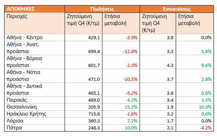 Διαφορετική εικόνα παρουσιάζουν οι τιμές αποθηκών προς πώληση για επαγγελματική χρήση, καθώς αφενός σε όλη την Αθήνα παρατηρείται πτώση-μέχρι και της τάξεως του 12,6% στο ανατολικά προάστια- και αφετέρου στις υπόλοιπες περιοχές στις οποίες πραγματοποιήθηκε η έρευνα του Spitogatos σημειώνεται αύξηση που αγγίζει μάλιστα το 15,2% στη Θεσσαλονίκη και το 10% στην Πάτρα. Όσο για τις ζητούμενες τιμές ενοικίασης αποθηκών, εκεί σημειώνονται ως επί το πλείστον μικρές αυξήσεις, με τη μεγαλύτερη να παρατηρείται στη Θεσσαλονίκη (10,3%) και τα βόρεια προάστια της Αθήνας (9,6%).