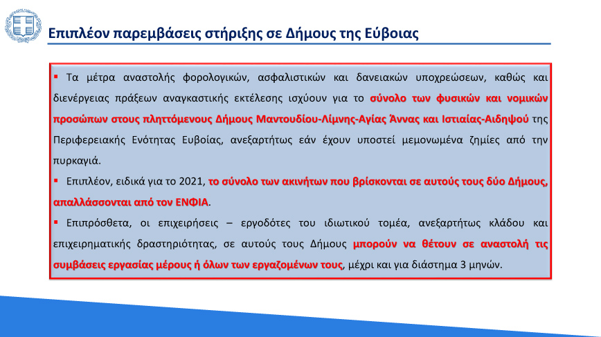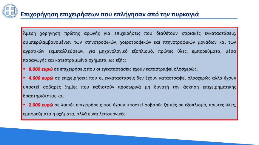 Νωρίτερα ο πρωθυπουργός, Κυριάκος Μητσοτάκης, είχε ανακοινώσει κατά την εισήγησή του στο Υπουργικό Συμβούλιο πως η στεγαστική συνδρομή θα φτάσει έως τις 150.000 ευρώ, ενώ η αποζημίωση των επιχειρήσεων θα φτάνει στο 70%.