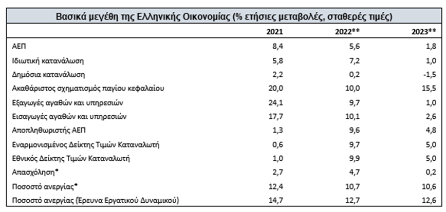 Για το 2022 προβλέπεται ρυθμός ανάπτυξης 5,6%, σχεδόν διπλάσιος του ευρωπαϊκού μέσου όρου, έναντι 5,3% που είχε προβλεφθεί στο Προσχέδιο του Κρατικού Προϋπολογισμού 2023, 4,5% που είχε προβλεφθεί στον Κρατικό Προϋπολογισμό του 2022 και 3,1% που είχε εκτιμηθεί στο Πρόγραμμα Σταθερότητας του Απριλίου 2022, τη στιγμή που ο Εναρμονισμένος Δείκτης Τιμών Καταναλωτή εκτιμάται να αυξηθεί κατά 9,7%, εν μέσω διεθνών πληθωριστικών πιέσεων. Το ποσοστό ανεργίας αναμένεται να συρρικνωθεί περαιτέρω και να διαμορφωθεί σε 12,7%, έναντι 13,9% που προβλεπόταν στο Πρόγραμμα Σταθερότητας και 14,2% στον Προϋπολογισμό του 2022.