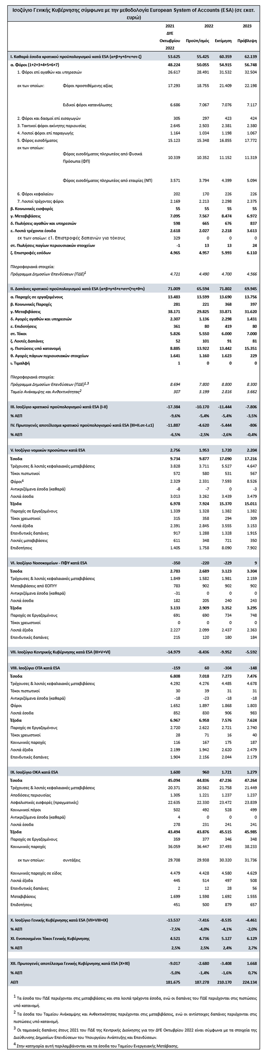 Στο ανωτέρω αποτέλεσμα, για το 2023 έχει συμπεριληφθεί το σύνολο των δημοσιονομικών μέτρων, ύψους 3,1 δισ. ευρώ από εθνικούς πόρους και 1,1 δισ. ευρώ από συγχρηματοδοτούμενους πόρους, που εξαγγέλθηκαν στη Διεθνή Έκθεση Θεσσαλονίκης και επιπλέον 1 δισ. ευρώ για αυξημένες δαπάνες αντιμετώπισης του αυξημένου πληθωρισμού και της ενεργειακής κρίσης.