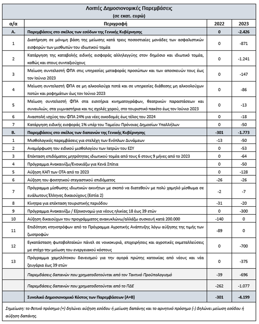 Για το 2023 έχει συμπεριληφθεί το σύνολο των δημοσιονομικών μέτρων, ύψους 3,1 δισ. ευρώ από εθνικούς πόρους και 1,1 δισ. ευρώ από συγχρηματοδοτούμενους πόρους, που εξαγγέλθηκαν στη Διεθνή Έκθεση Θεσσαλονίκης και επιπλέον 1 δισ. ευρώ για αυξημένες δαπάνες αντιμετώπισης του αυξημένου πληθωρισμού και της ενεργειακής κρίσης.