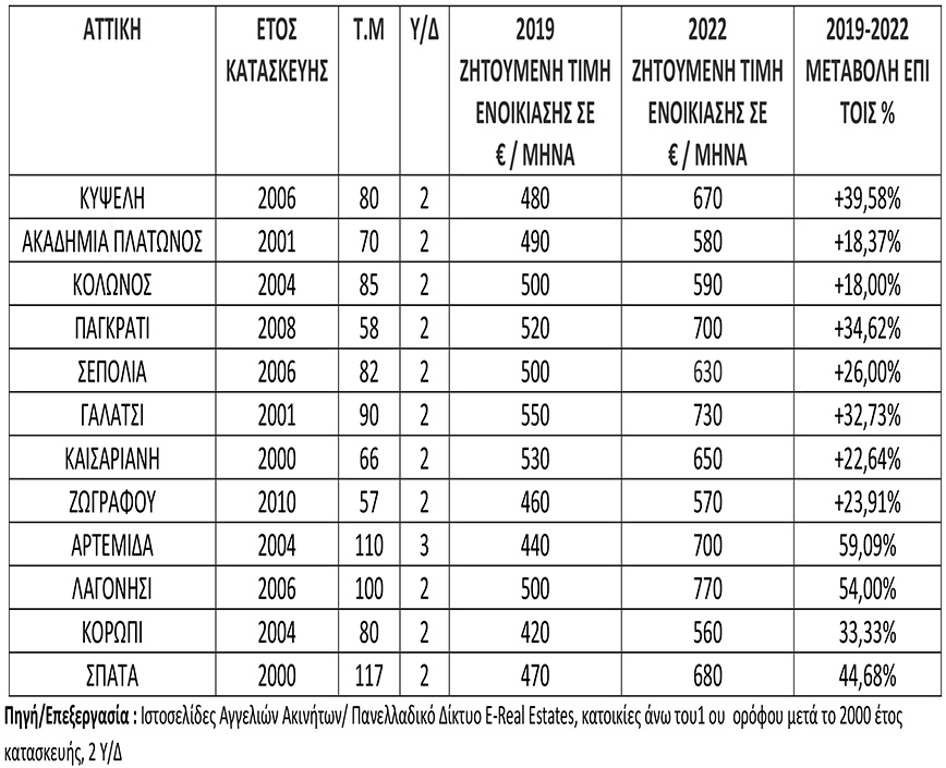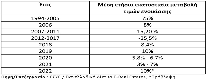 Σύμφωνα με τα στοιχεία της ΕΣΥΕ, τα ενοίκια αυξήθηκαν κατά 5 ποσοστιαίες μονάδες πάνω από τον πληθωρισμό το 2005 και κατά 5,8 ποσοστιαίες μονάδες πάνω από τον πληθωρισμό το πρώτο τρίμηνο του 2006. Ενώ από το 2007 έως και το 2011 καταγράφηκε αύξηση των ενοικίων +15,20 % , από το 2012 ως το 2017 καταγράφηκε μείωση που άγγιξε το -25,5 %, ενώ το 2018 επιστρέφουν με αύξηση +8,4 % , το 2019 ο ρυθμός αύξησης των ενοικίων άγγιξε το +10% και το 2020 κυμάνθηκε από 5,8% έως 6,7%. Η ανοδική πορεία συνεχίστηκε και το 2021 από 3% έως 7%, ενώ τη φετινή χρονιά θα αγγίξει το +10%.