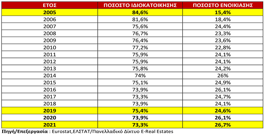 Το διάστημα από το 2005 έως το 2021, το ποσοστό ιδιοκατοίκησης στη χώρα μας υποχώρησε από το 84,6% στο 73,3%, χάνοντας 11,3 ποσοστιαίες μονάδες σύμφωνα με στοιχεία της Eurostat. Τα άνωθεν δεδομένα καταγράφουν τις αρνητικές επιπτώσεις των μνημονιακών χρόνων στη χώρα μας. Το 2015, το ποσοστό ιδιοκατοίκησης στην Ελλάδα ανήλθε στο 75,1% με αρνητικές διακυμάνσεις την επόμενη τριετία (2016,2017,2018), ενώ το 2019 αυξήθηκε στο 75,4%.