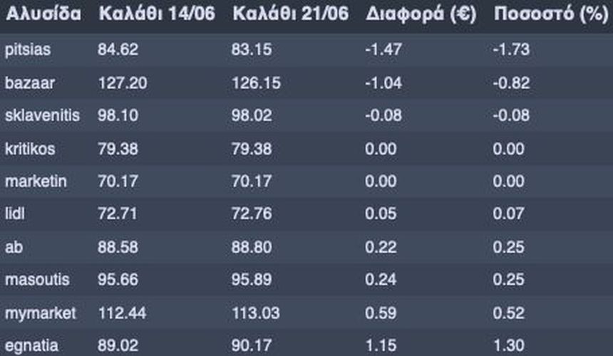 Αναλυτικά στον πίνακα που επισυνάπτεται το κόστος του «Καλαθιού του Νοικοκυριού» ανά σούπερ μάρκετ και η μεταβολή του από την 33η στην 34η εβδομάδα.