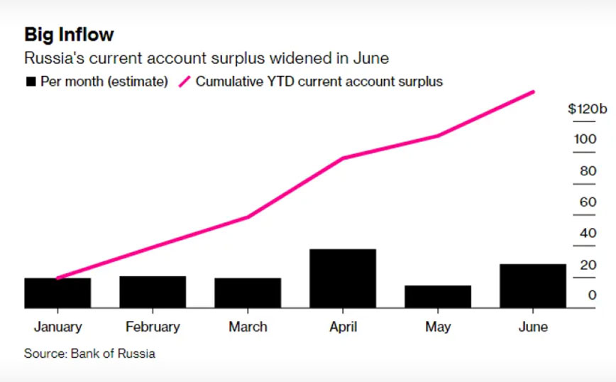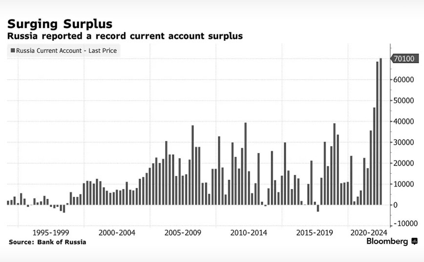 Με βάση τα δεδομένα λοιπόν, το πλεόνασμα της Ρωσίας ήταν το μεγαλύτερο τουλάχιστον από το 1994, ενώ για τους πρώτους έξι μήνες του 2022, το πλεόνασμα έφτασε τα 138,5 δισεκατομμύρια δολάρια, ανέφερε η κεντρική τράπεζα της Ρωσίας.