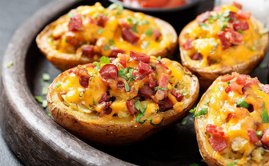 Άνοιξε το εσωτερικό των μισών ψημένων πατατών, γέμισε τες με τυρί, κομμάτια μπέικον και μια κουταλιά sour cream. Βάλε τα ξανά στο φούρνο μέχρι να φουσκώσουν από το τυρί.