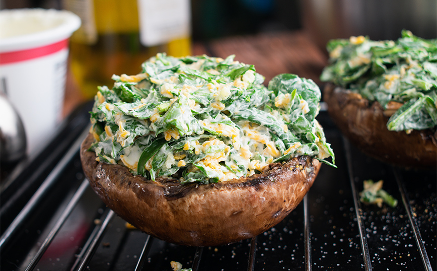 Ξεφλούδισε μανιτάρια και γέμισε τα με ένα μείγμα από τυρί κρέμα, σκόρδο, βότανα και φρυγανιά. Ψήσε μέχρι τα μανιτάρια να μαλακώσουν και η γέμιση να πάρει χρώμα.
