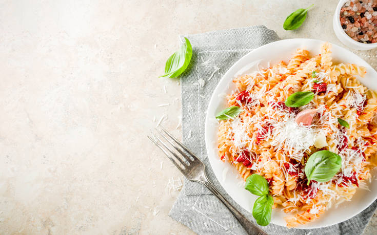 Μια λαχταριστή μακαρονάδα αναδεικνύεται σε όλη της τη μεγαλοπρέπεια με λίγο τριμμένο τυρί στην κορυφή.