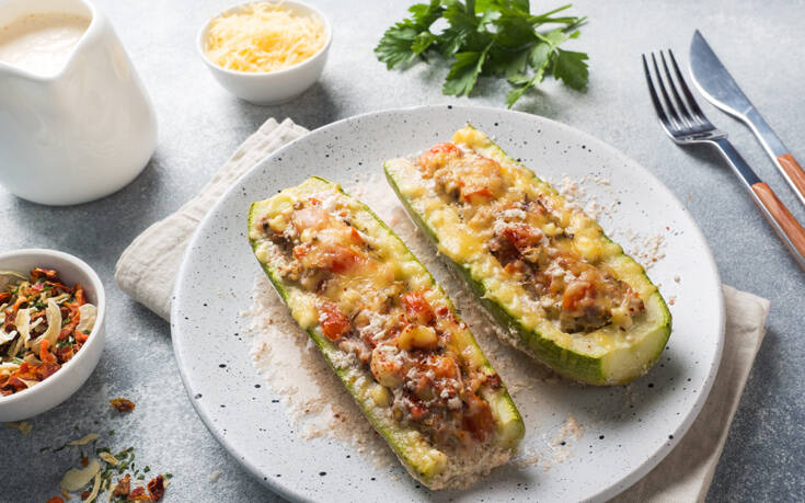 - Γεμίστα τα κολοκυθάθια με το μείγμα και τοποθετήστε τα σε ένα ταψί.