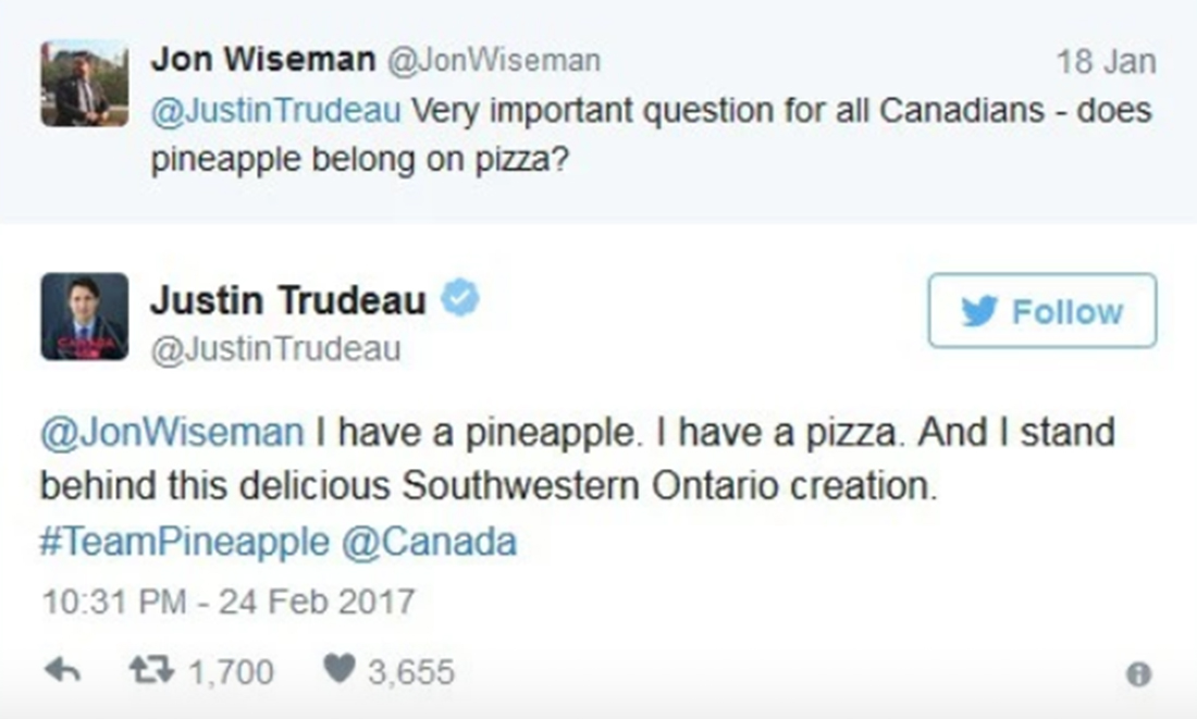 Αυτό οδήγησε στην αποστολή χαβανέζικων πιτσών στην ισλανδική πρεσβεία στο Λονδίνο και ο Τζάστιν Τριντό, πρωθυπουργός του Καναδά, υπερασπίστηκε με πάθος τη γαστρονομική συνεισφορά της χώρας του σε ένα tweet. «Έχω έναν ανανά. Έχω μια πίτσα. Και στέκομαι πίσω από αυτή τη νόστιμη δημιουργία του νοτιοδυτικού Οντάριο».