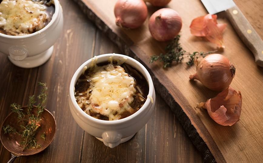 - Για να σερβίρετε, τοποθετήστε μπολ ή ραμεκέν στο γκριλ και βάλτε 2 φέτες ψωμιού στο καθένα. Περιχύστε με σούπα, προσθέστε το τριμμένο τυρί και ψήστε μέχρι να λιώσει το τυρί.