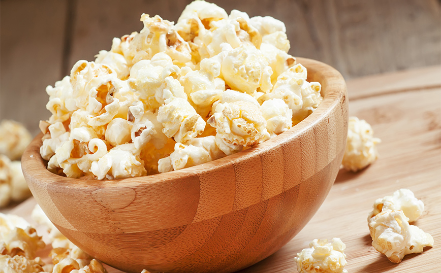 Αντί για ποπ κορν με βούτυρο ή λάδι, επίλεξε να φτιάξεις ποπ κορν που έχει σκάσει στον αέρα. Είναι ένα σνακ που έχει λίγες θερμίδες και υψηλή περιεκτικότητα σε φυτικές ίνες. Πασπάλισε με λίγη διατροφική μαγιά, μια πρέζα αλάτι ή το αγαπημένο σου μπαχαρικό για επιπλέον γεύση.