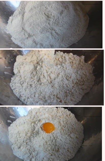 Αμέσως μετά προσθέτουμε το ανάλατο βούτυρο κομμένο σε κύβους και το ενώνουμε το αλεύρι ανακατεύοντας με το σύρμα μέχρι να ενωθεί με το αλεύρι. Προσθέτουμε τον κρόκο αυγού και συνεχίζουμε το ανακάτεμα. Στη συνέχεια ρίχνουμε στο ½ κουταλιά του γλυκού παγωμένο νερό και ανακατεύουμε. Το παγωμένο νερό βοηθά να δημιουργηθεί σταδιακά μια ζύμη.