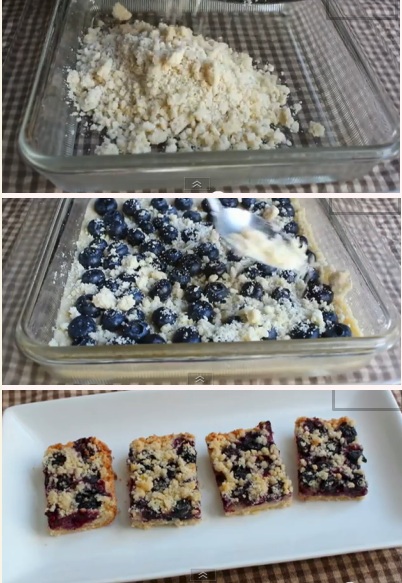 Προθερμαίνουμε τον φούρνο στους 180 βαθμούς. Ρίχνουμε τα ¾ από το μείγμα μέσα σε ένα πυρέξ και το πατάμε με ένα κουτάλι για να ισιώσει το μείγμα. Προσθέτουμε από πάνω τα μύρτιλλα και από πάνω καλύπτουμε με το υπόλοιπο ¼ της ζύμης.
