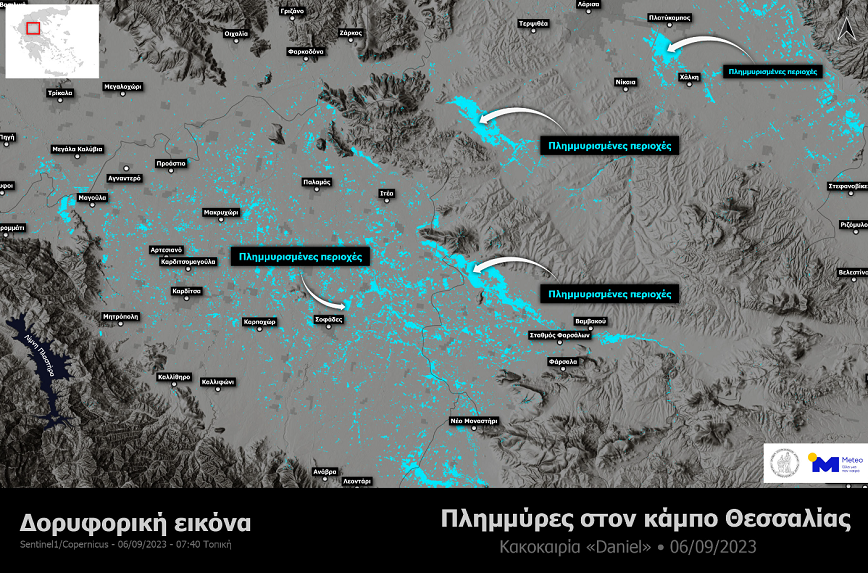 Η δορυφορική εικόνα προέρχεται από το ραντάρ του ευρωπαϊκού δορυφόρου Sentinel-1 και σύμφωνα με το meteo.gr του Εθνικού Αστεροσκοπείου ακόμη και περιοχές όπου δεν σημειώθηκαν μεγάλα ύψη βροχής, έχουν κατακλυστεί από τα νερά χειμάρρων και παραποτάμων του Πηνειού, τα οποία κατεβαίνουν ορμητικά σε χαμηλότερα υψόμετρα από τα ορεινά της Πίνδου.
