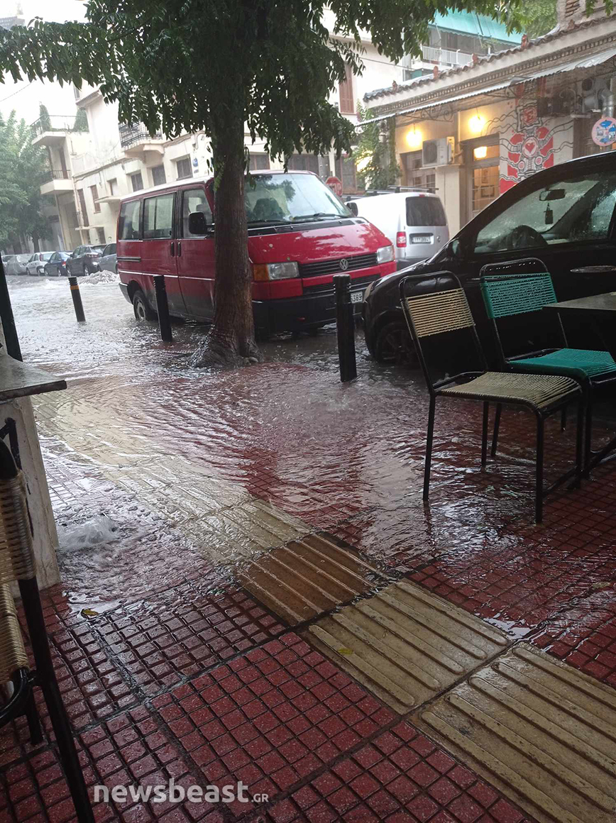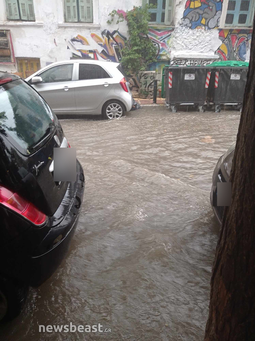 Στο Θησείο διακρίνεται το νερό να έχει μετατρέψει σε ποτάμια τους δρόμους, εικόνα που επικρατεί και τον Κεραμεικό.