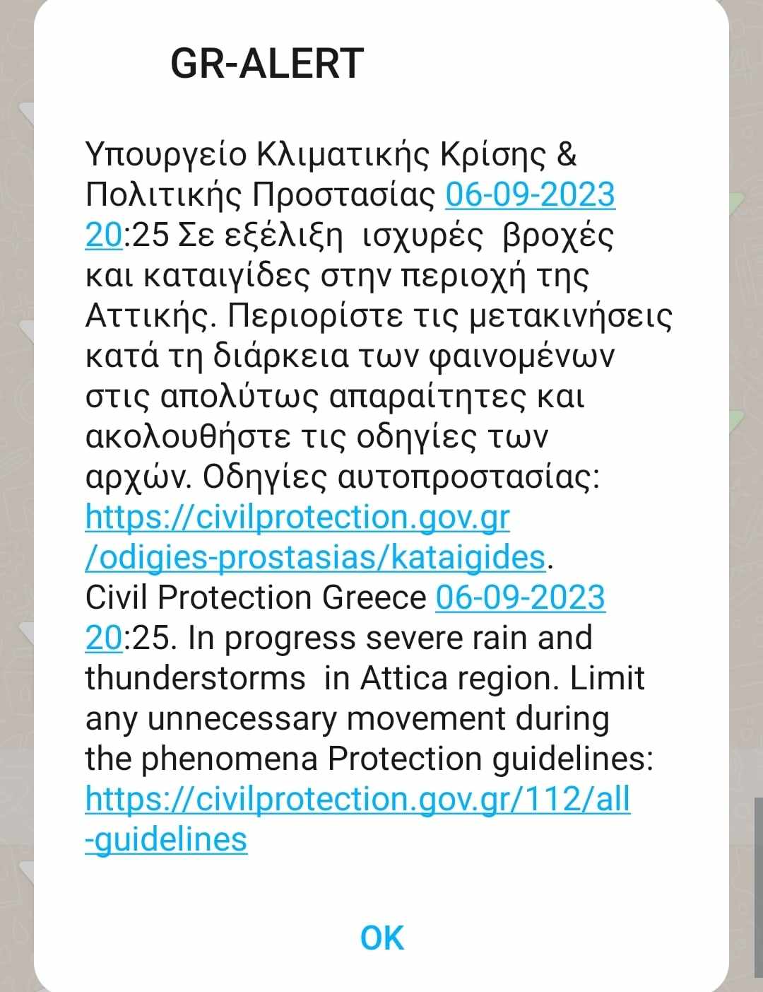 «Σε εξέλιξη ισχυρές βροχές και καταιγίδες στην περιοχή της Αττικής. Περιορίστε τις μετακινήσεις κατά τη διάρκεια των φαινομένων στις απολύτως απαραίτητες και ακολουθήστε τις οδηγίες των αρχών»