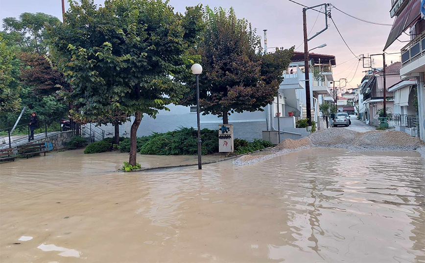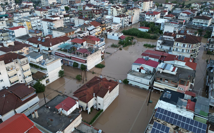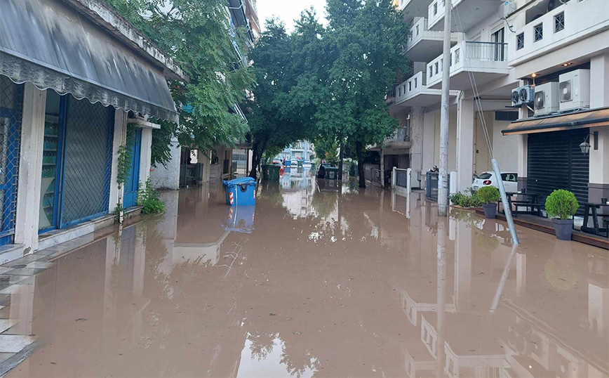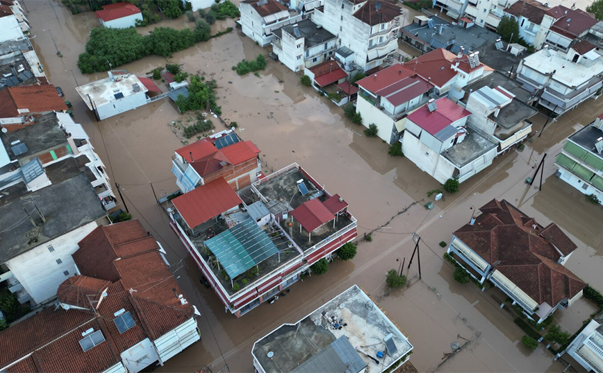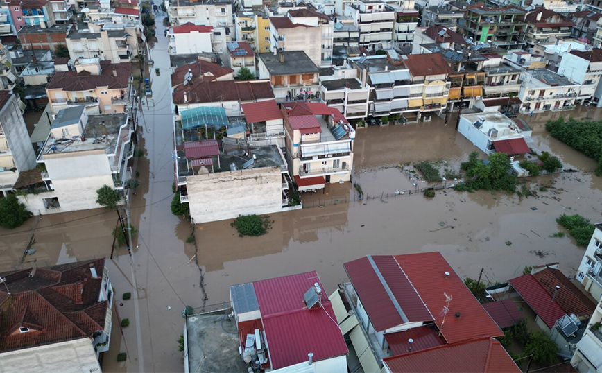 Τα νερά έχουν καλύψει πλέον δρόμους, αυλές σπιτιών, ενώ από αυτοκίνητα φαίνονται μόνο οι οροφές.