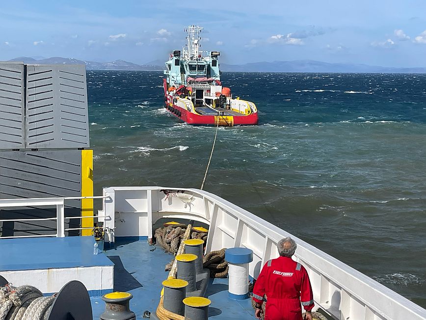 Σε μικρή απόσταση από το λιμάνι της Ραφήνας και αναμένοντας ρυμουλκό για να το επιστρέψει με ασφάλεια στη Ραφήνα, παραμένει το «Fast Ferries Andros» με 734 επιβάτες.