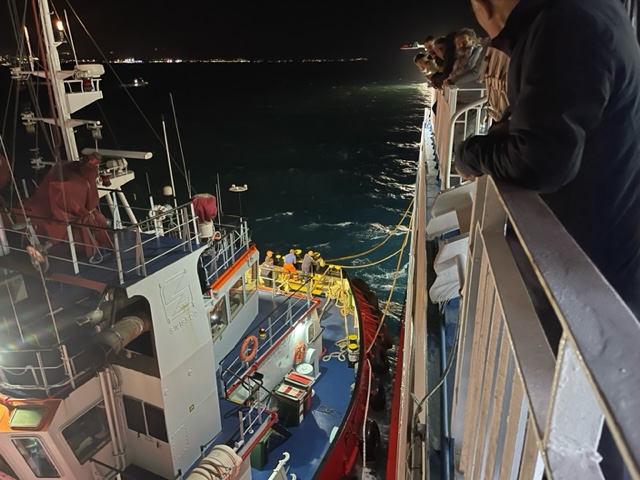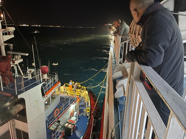 Σύμφωνα με επιβάτη μέσα από το πλοίο βρίσκεται σε εξέλιξη η προσπάθεια απεμπλοκής της καδένας της άγκυρας από την προπέλα του πλοίου, για να ακολουθήσει η ρυμούλκηση.