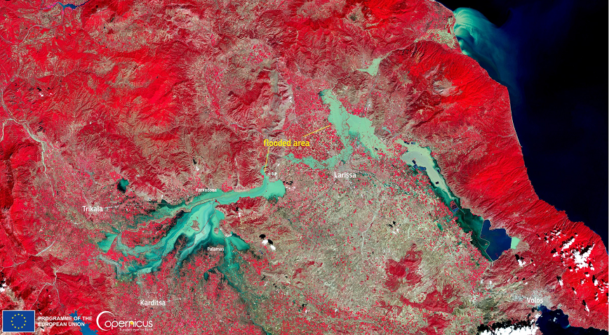 Στις 10 Σεπτεμβρίου, το Sentinel2 κατέγραψε αυτή την εικόνα από την περιοχή γύρω από τη Λάρισα, η οποία εξακολουθεί να πλήττεται σε μεγάλο βαθμό από τις πλημμύρες που προκλήθηκαν από την υπερχείλιση του ποταμού Πηνειού».