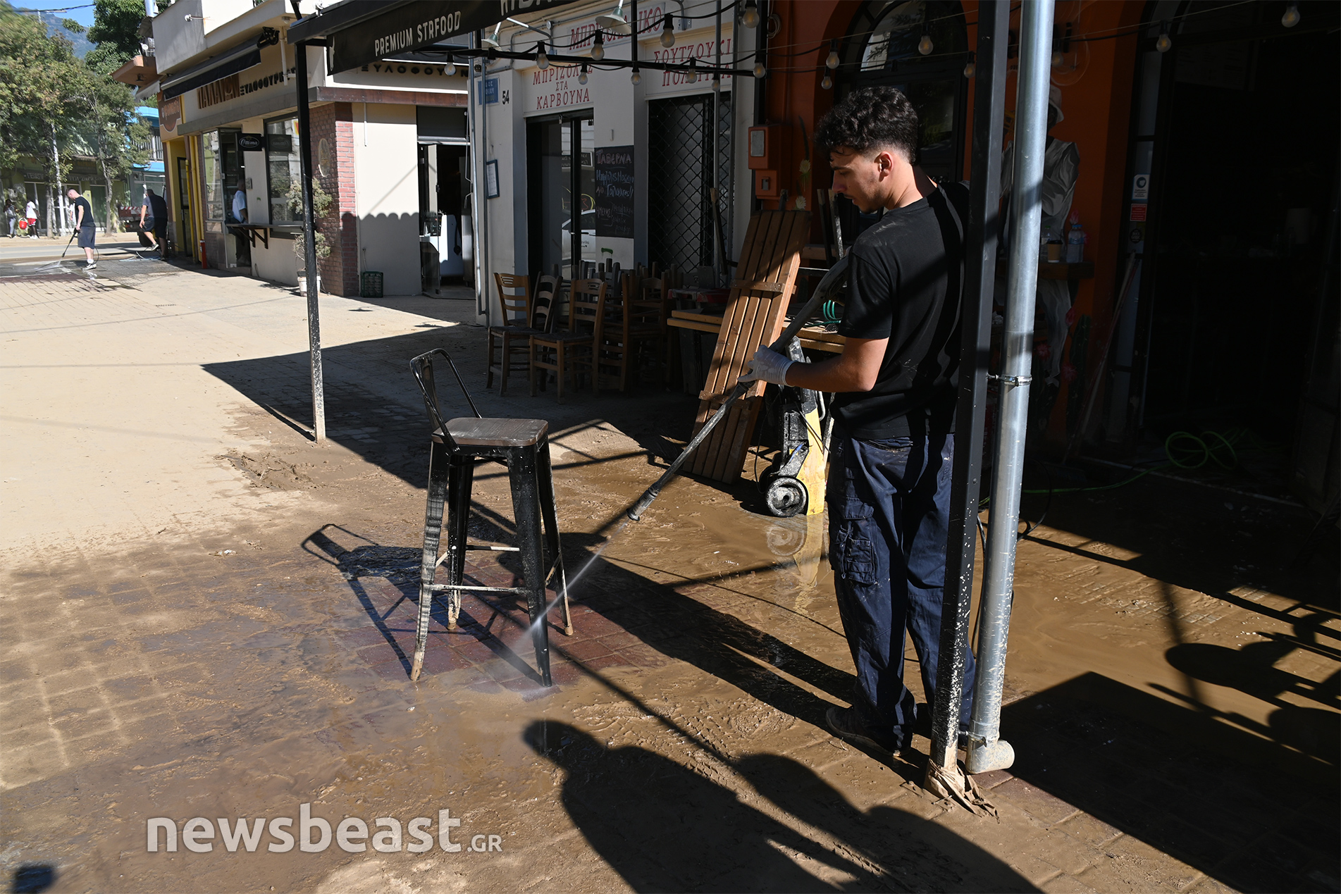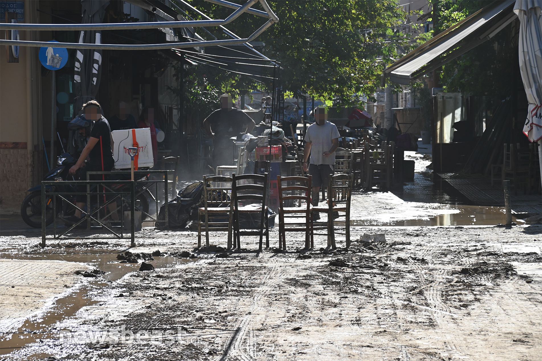 Έβγαζαν με τα χέρια τους έξω από τα μαγαζιά τους τα τραπέζια και τις καρέκλες για να τα πλύνουν ενώ προσπαθούσαν να παράλληλα να απομακρύνουν τα χώματα από τον δρόμο.