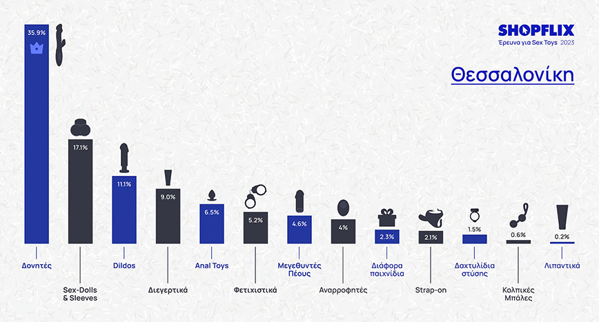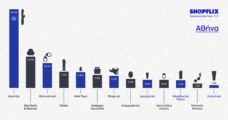 Την πρωτιά όμως έχουν οι δονητές (31,5%) στις προτιμήσεις των Ελλήνων και μάλιστα με μεγάλη διαφορά από τη δεύτερη θέση που πάει στα φετιχιστικά 11,2%). Την πεντάδα συμπληρώνουν οι sex-dolls, τα anal toys και τα dildos.