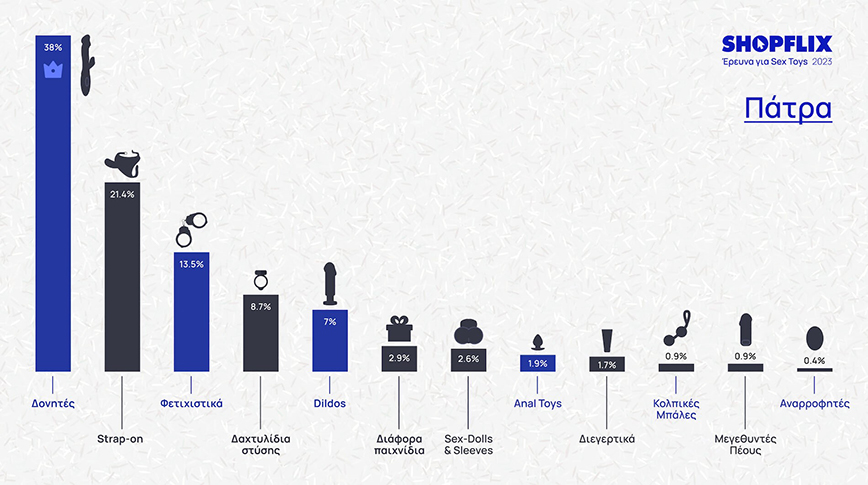 Οι δονητές είναι παντού πρώτοι, με την Αθήνα να κλείνει την πρώτη 3άδα με sex dolls και φετιχιστικά, την Θεσσαλονίκη με sex dolls και dildos, στην Πάτρα εμφανίζονται στην 2η θέση τα stap-on και κλείνει η τριάδα με φετιχιστικά, ενώ στη λίστα εμφανίζονται για πρώτη φορά τα δαχτυλίδια στύσης και μάλιστα στην 4η θέση.