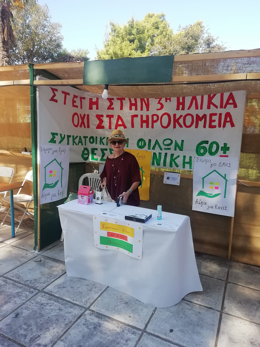 Η ομάδα, με κεντρικό πανό «Στέγη στην 3η ηλικία, όχι στα γηροκομεία», θα βρίσκεται σε περίπτερο στο Greenwave Festival που ολοκληρώνεται αύριο το βράδυ και διοργανώνεται από την Οικολογική Κίνηση Θεσσαλονίκης, στο πάρκο της ΧΑΝΘ.