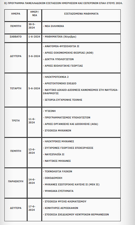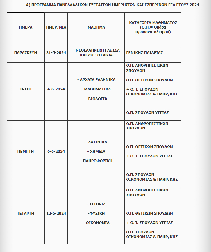 Το πλήρες πρόγραμμα των Πανελλαδικών Εξετάσεων 2024 ανακοίνωσε σήμερα το Υπουργείο Παιδείας και Θρησκευμάτων. Η έναρξη των Πανελληνίων για τα ημερήσια και εσπερινά γενικά λύκεια της χώρας είναι η Παρασκευή, 31/05, ενώ για τα ημερήσια και εσπερινά επαγγελματικά λύκεια η Πέμπτη, 30/05.