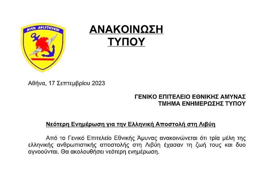 Από το Γενικό Επιτελείο Εθνικής Άμυνας ανακοινώνεται ότι τρία μέλη της ελληνικής ανθρωπιστικής αποστολής στη Λιβύη έχασαν τη ζωή τους και δυο αγνοούνται. Θα ακολουθήσει νεότερη ενημέρωση.
