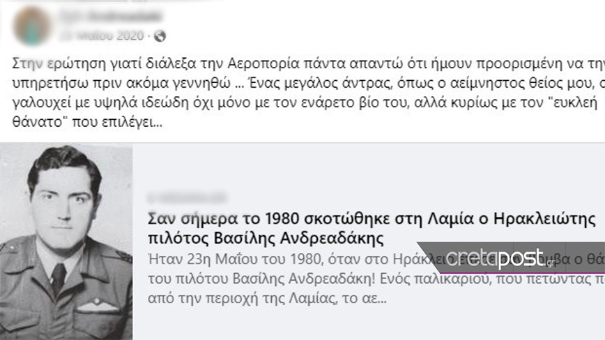 Συγκεκριμένα, ο θείος της ήταν ο Βασίλης Ανδρεαδάκης που στις 23 Μαΐου του 1980 την ώρα που πραγματοποιούσε πτήση πάνω από την Λαμία το σκάφος παρουσίασε βλάβη. Ενώ ο πύργος ελέγχου του λέει να εγκαταλείψει το σκάφος εκείνος, βλέποντας πως αν το έκανε αυτό το αεροσκάφος θα έπεφτε μέσα στην πόλη της Λαμίας, αρνήθηκε και το οδήγησε έξω από την πόλη, βρίσκοντας τραγικό θάνατο κατά την πτώση του.